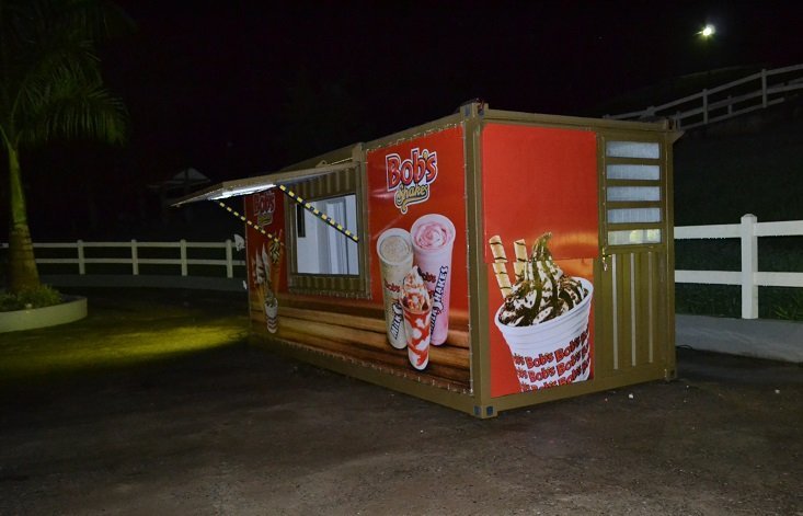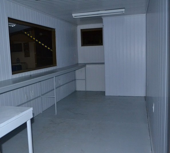 Contém: 01 porta, Ar condicionado 220V, isolamento termo acústico revestido em PVC branco, janela basculante 920x1920mm na lateral do módulo com luminária, banheiro revestido com 01 pia, 01 sanitário, instalação elétrica (220v) com interruptor, tomada elétrica e telefônica (rede).